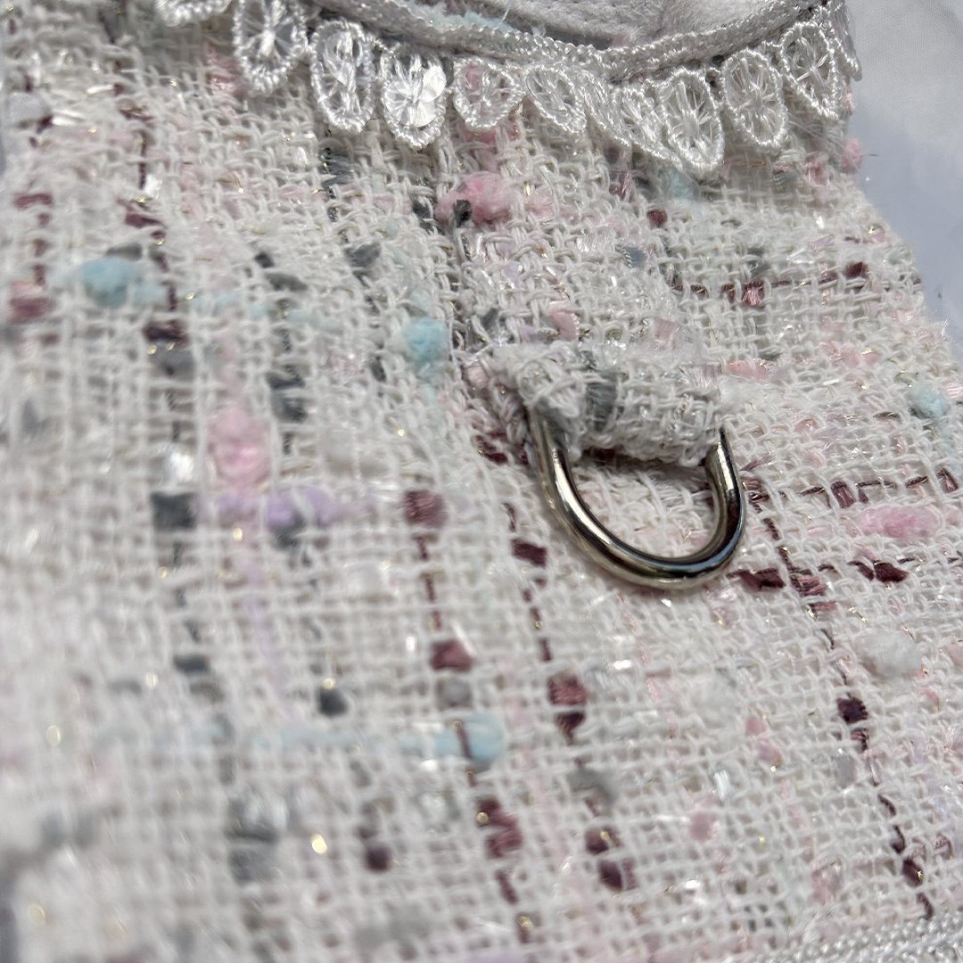 Elevate your pet’s style with our Envogue Dog Harness Collection by Hello Doggie. Each harness is thoughtfully designed, ensuring every baby receives the royal treatment they deserve. From the very selection of fabrics to the intricate piecing together of each harness, no detail is spared in creating these masterpieces. One of the standout features of our luxury dog harnesses is each one has their own unique lace trimming, with a range of classic and trendy styles to choose from, you can find the perfect style to suit your pup's personality and meet their fashion needs. It's not always that luxury items are comfortable, but Hello Doggie prioritizes on comfort and functionality of our harnesses. Thoughtful features such as Velcro straps are easy-to-use fasteners making it a breeze to put on and take off, ensuring a hassle-free experience for both you and your furry baby. When it comes to caring for your luxury dog harness, our high standards extend beyond its creation, to keep the coat looking its best so that your pup can continue to strut their stuff in style, spot clean or wash on delicate, no bleach or softener and air dry. Not only can you elevate your baby’s wardrobe all year round, matching coats for those cold chilly days are also available, sold separately.  *Check Size Chart*  Limited Edition  MSRP $84.00  *Harnesses are handmade sizes may vary slightly. Made in USA.